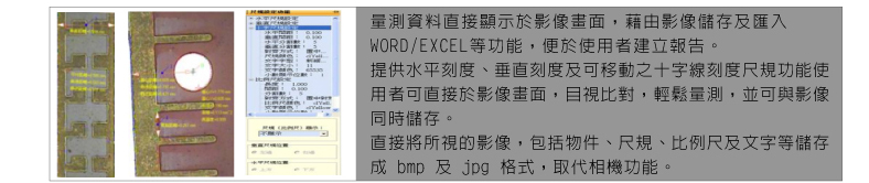 量測系統:可量測距離,圓,角度及一些2D量測,並可將資料轉作WORD及EXCEL報表,具有照像功能,可存檔。 |
